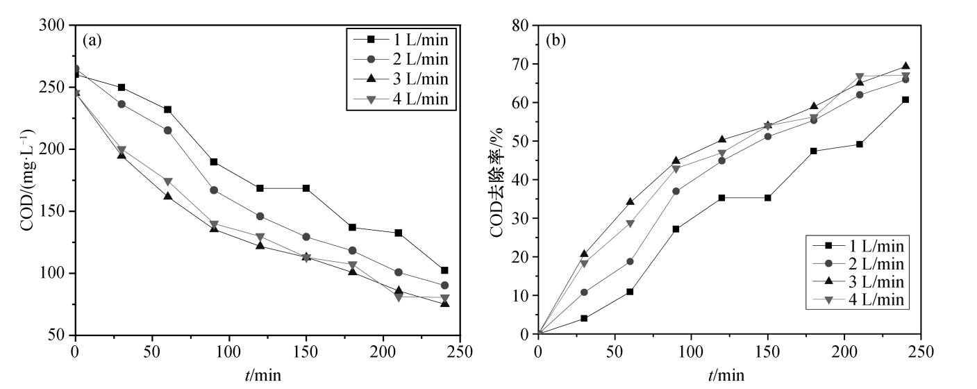 在催化劑投加量為 30%, 初始 pH 為 7 的條件下, 設置臭氧氣體流量分別為 1, 2, 3和 4 L/min, 探討臭氧氣體流量對催化臭氧化降解效果的影響, 實驗結果如圖 所示。