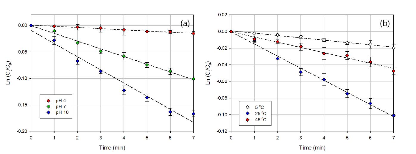 我們在同一反應器中僅在H2O2,納米氧氣泡,大臭氧氣泡,納米臭氧氣泡和納米臭氧/ H2O2過程中對TMAH進行了降解動力學。在臭氧化過程中,臭氧氣體不斷流入反應器。在納米臭氧/ H2O2反應期間,H2O2的初始濃度為100 mg / L。分別使用5 mM乙酸鹽,磷酸鹽和硼酸鹽緩沖液將包含TMAH的合成半導體廢水的pH值分別調(diào)節(jié)為4、7和10。使用冷室和水浴保持合成廢水的溫度。在臭氧化和納米臭氧/ H2O2反應期間,分別注入含或不含H2O2溶液的TMAH后,立即將含TMAH和緩沖液的合成廢水置于臭氧中。在實驗期間,環(huán)境空氣溫度保持恒定在5.0、25.0、45.0±1.0°C。