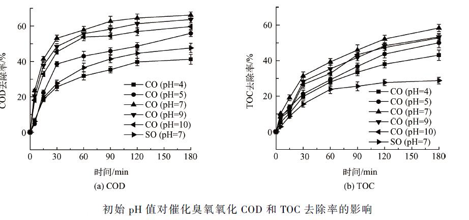 由圖1可知,催化臭氧氧化(catalytic ozonation,CO)的COD 去除率可以達(dá)到(66. 2 ± 1. 7)% ,比單獨(dú)臭氧氧化(single ozonation,SO) 的(47. 6 ± 2. 6)% 提高了近20 個(gè)百分點(diǎn);而TOC 去除率則可以達(dá)到(58. 4 ± 2. 1)% ,比單獨(dú)臭氧氧化的(28. 8 ± 1. 9)% 提高了近1 倍。調(diào)節(jié)廢水pH 值,無(wú)論是酸性(pH = 4,5),還是堿性(pH = 9,10),催化臭氧氧化的效果都不如中性(pH = 7)的效果好,這可能是因?yàn)榱u基氧化鐵的零電荷點(diǎn)(pHpzc )在中性附近,過(guò)酸和過(guò)堿都影響了羥基氧化鐵表面羥基的電荷形態(tài)。需要注意的是:當(dāng)pH = 4 時(shí),COD 的去除率不如單獨(dú)氧化的,但TOC 的去除率卻比單獨(dú)氧化的高。這是因?yàn)閱为?dú)臭氧氧化很難降解煤化工生化出水中的難降解有機(jī)物,從而TOC去除率低;而pH = 4 時(shí)催化臭氧氧化一定程度上降解了這部分難降解有機(jī)物,甚至是難以測(cè)出COD 的有機(jī)物,但效果沒(méi)有中性和堿性條件下的好,依然有一部分降解不完全,反而被檢測(cè)出COD,從而COD 的去除率反而降低。