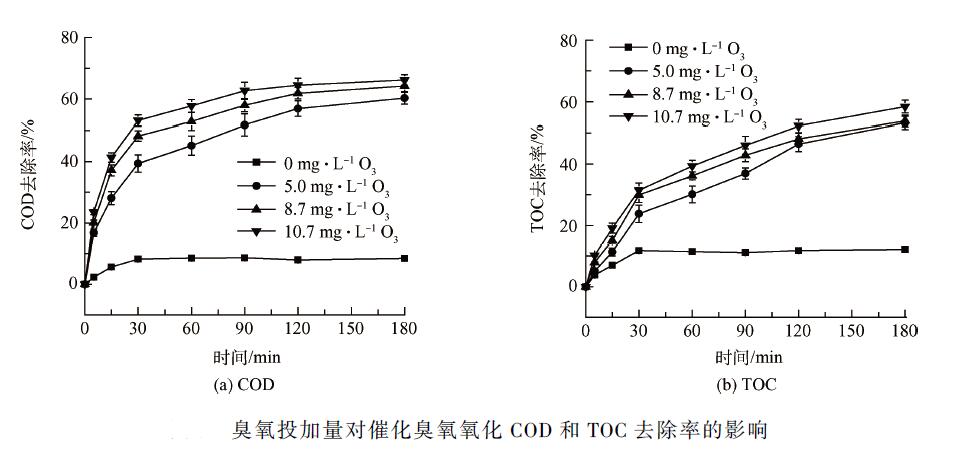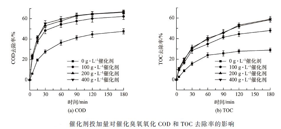 臭氧是有機(jī)物降解的直接動(dòng)力,其投加量直接影響催化臭氧氧化的速率及效果。實(shí)驗(yàn)通過(guò)調(diào)節(jié)所用臭氧發(fā)生器電流檔位改變臭氧投加量,并用碘量法測(cè)出臭氧產(chǎn)生量。廢水不調(diào)節(jié)pH 值(中性),催化劑投加量為200 g·L - 1 。由圖3 可知,不通臭氧,單純通空氣時(shí),催化劑對(duì)廢水只有吸附作用,此時(shí)COD 和TOC 的去除率僅有(8. 6 ± 0. 3)% 和(12. 1 ± 0. 4)% 。增大臭氧投加量對(duì)COD 和TOC 的去除率的提有限,這可能與臭氧的利用率有關(guān),有效利用的臭氧較少,但增大臭氧投加量,有利于三相界面的傳質(zhì),反應(yīng)速率更快,特別是在短時(shí)間內(nèi)效果顯著。