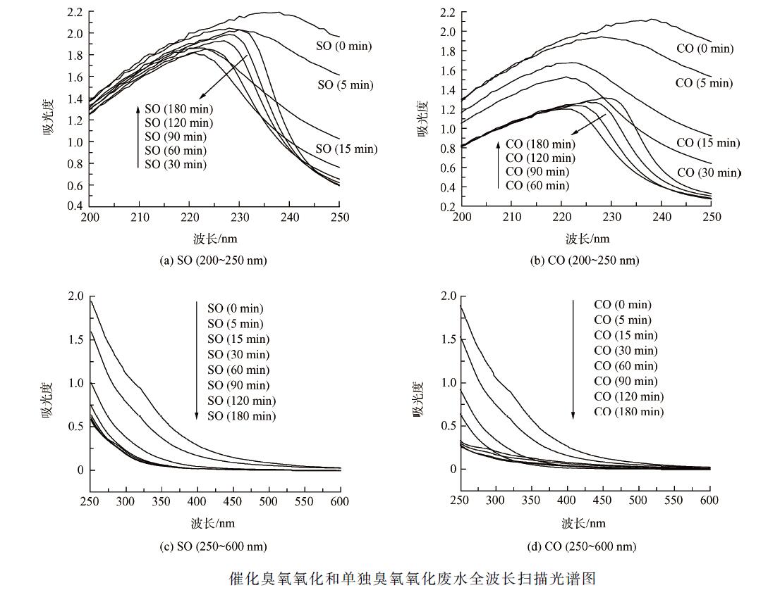 由圖4 可知,廢水在200 ~ 300 nm 波段有很強(qiáng)的吸收,300 nm 以上波段吸收較弱,處理后各波段吸光度都有所下降,表明單獨(dú)臭氧氧化和催化臭氧氧化對(duì)廢水有機(jī)物都有作用。其中,隨著反應(yīng)的進(jìn)行,單獨(dú)臭氧氧化和催化臭氧氧化在220 ~ 250 nm 波段的吸收都有所增強(qiáng),說(shuō)明溶液中共軛雙鍵增多,這很有可能是廢水中苯環(huán)開(kāi)環(huán)的結(jié)果。相對(duì)而言,催化臭氧氧化在220 ~ 250 nm 波段的吸收較單獨(dú)臭氧氧化的弱,說(shuō)明催化臭氧氧化對(duì)共軛雙鍵的作用比單獨(dú)臭氧氧化強(qiáng),處理效果更好,這也是催化臭氧氧化的TOC 去除率更高的原因。