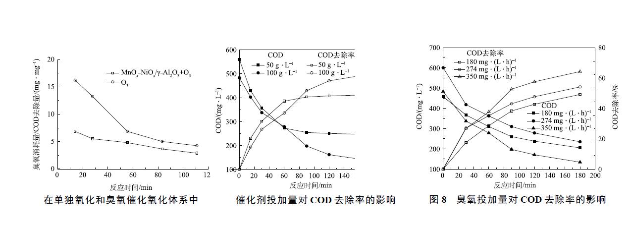 5) 連續(xù)進(jìn)行4 h 的臭氧催化氧化實(shí)驗(yàn)后發(fā)現(xiàn),MnOx-NiOx/γ-Al2O3 穩(wěn)定性和重復(fù)利用性較好,COD 去除率能維持在42% 左右不變,錳、鎳離子的溶出量均小于0.5 mg·L−1。
