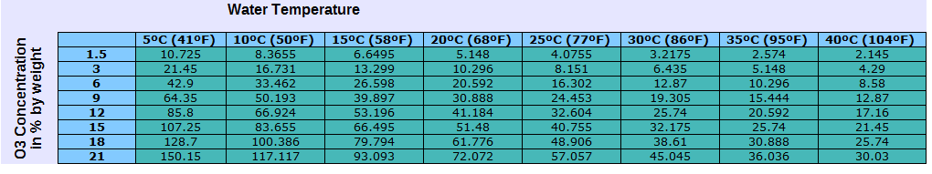 下表根據水溫和臭氧濃度(以重量%表示)顯示了臭氧在水中的溶解度。