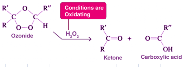 氧化處理:當(dāng)使用氧化劑過氧化氫代替鋅或二甲基硫來處理該臭氧化物時,所形成的醛被氧化為羧酸。 高熱酸存在下的高錳酸鉀也可用于氧化處理。